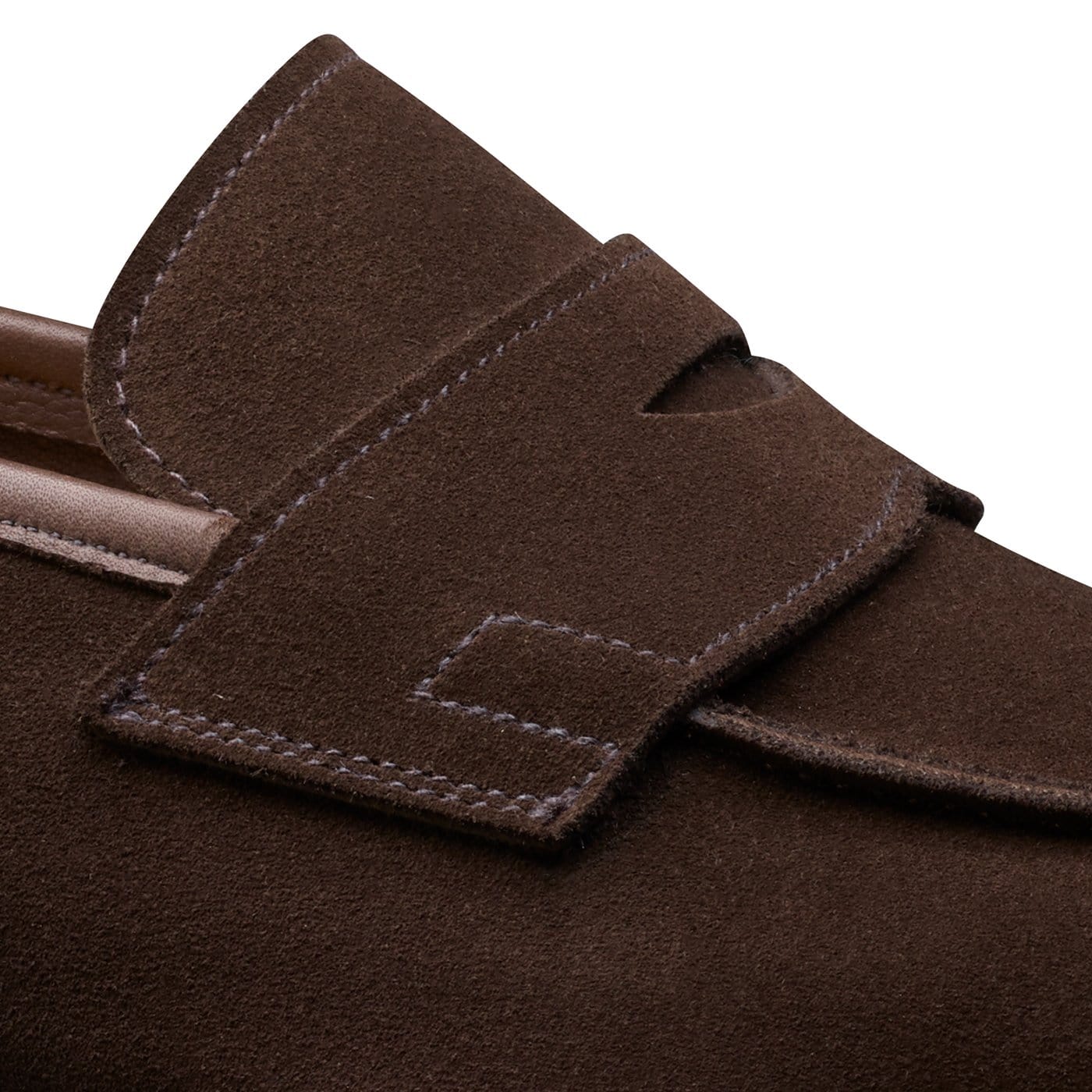 Cadogan, an unlined penny loafer made from the finest dark brown calf suede with bark tanned single leather soles. From the Hand Grade collection.