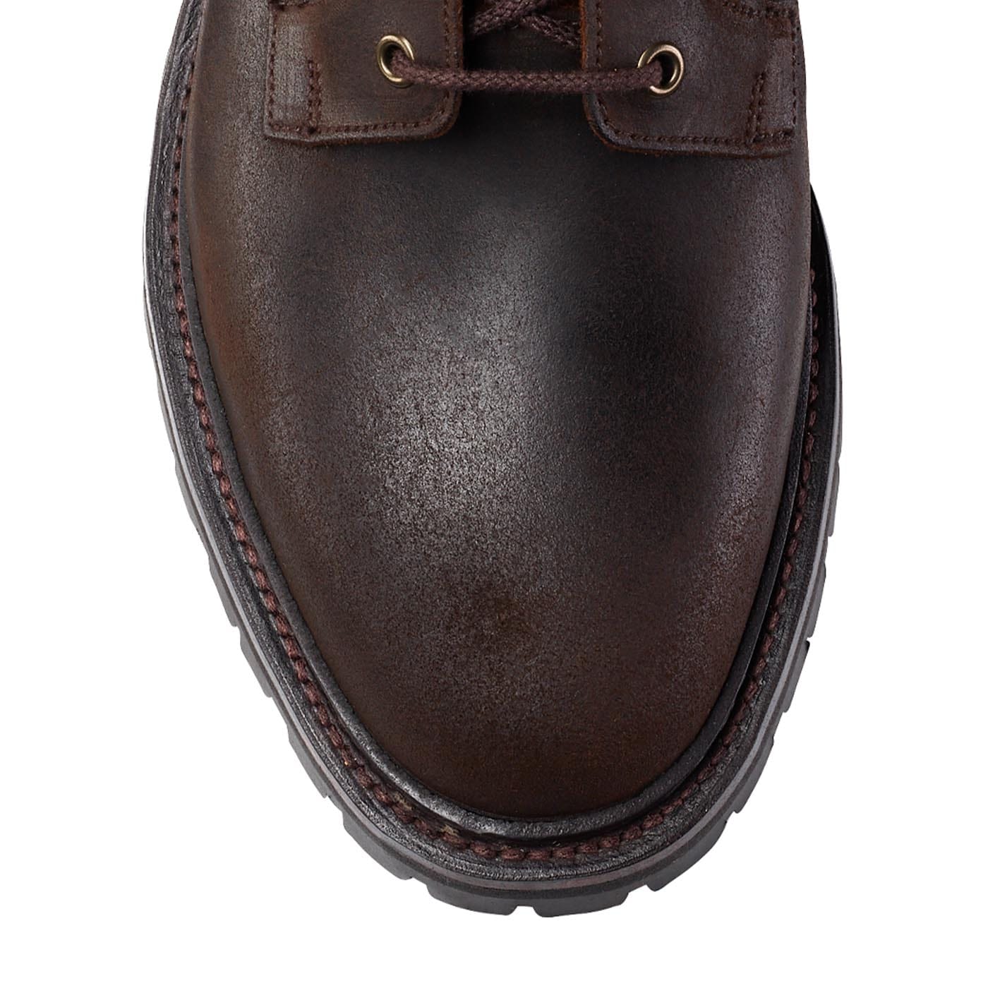 Grizedale in dark brown rough-out suede features our cleated rubber sole, antique brass eyelets and a heavier than usual lace, there is also a hidden secret beneath… A half bellows tongue, made fro…