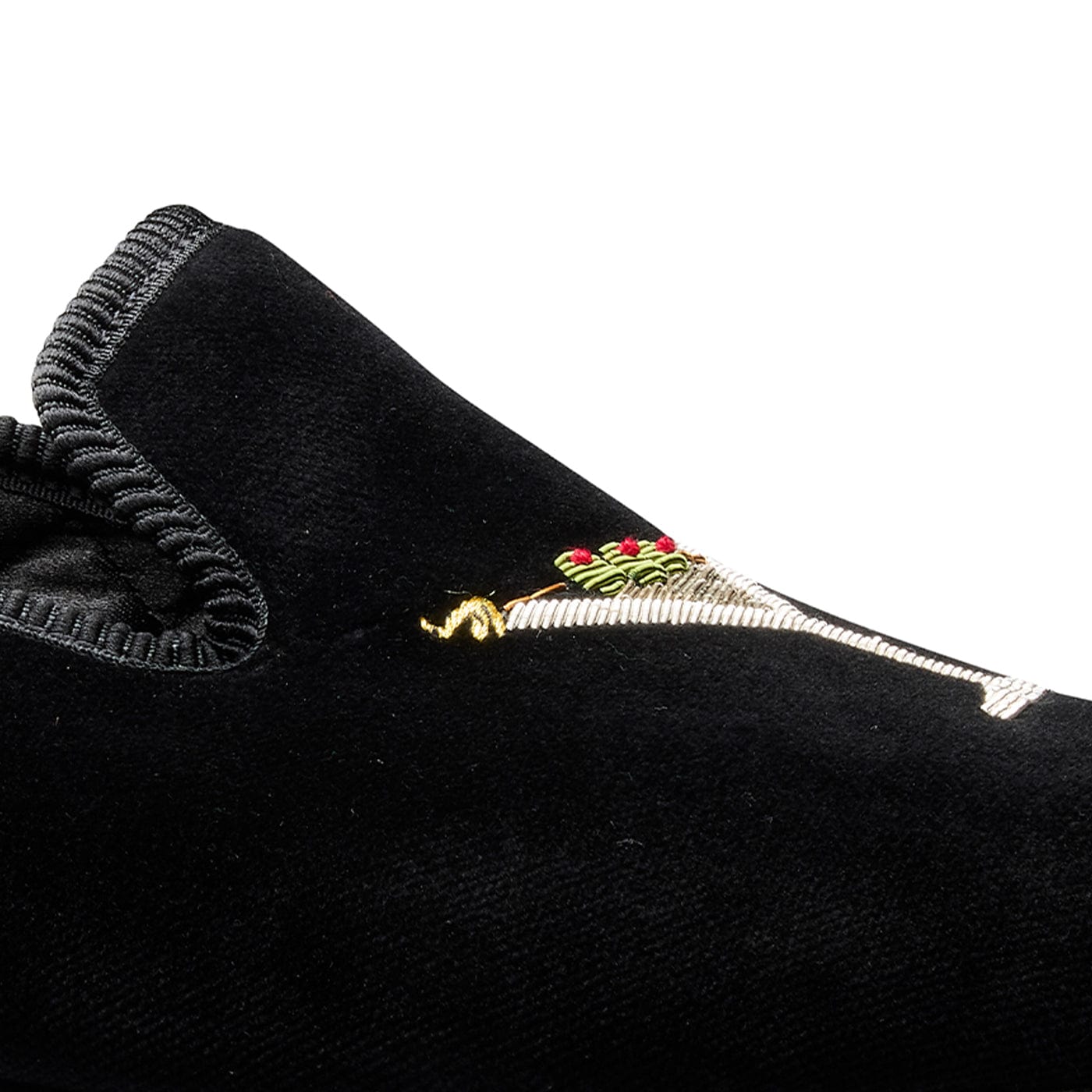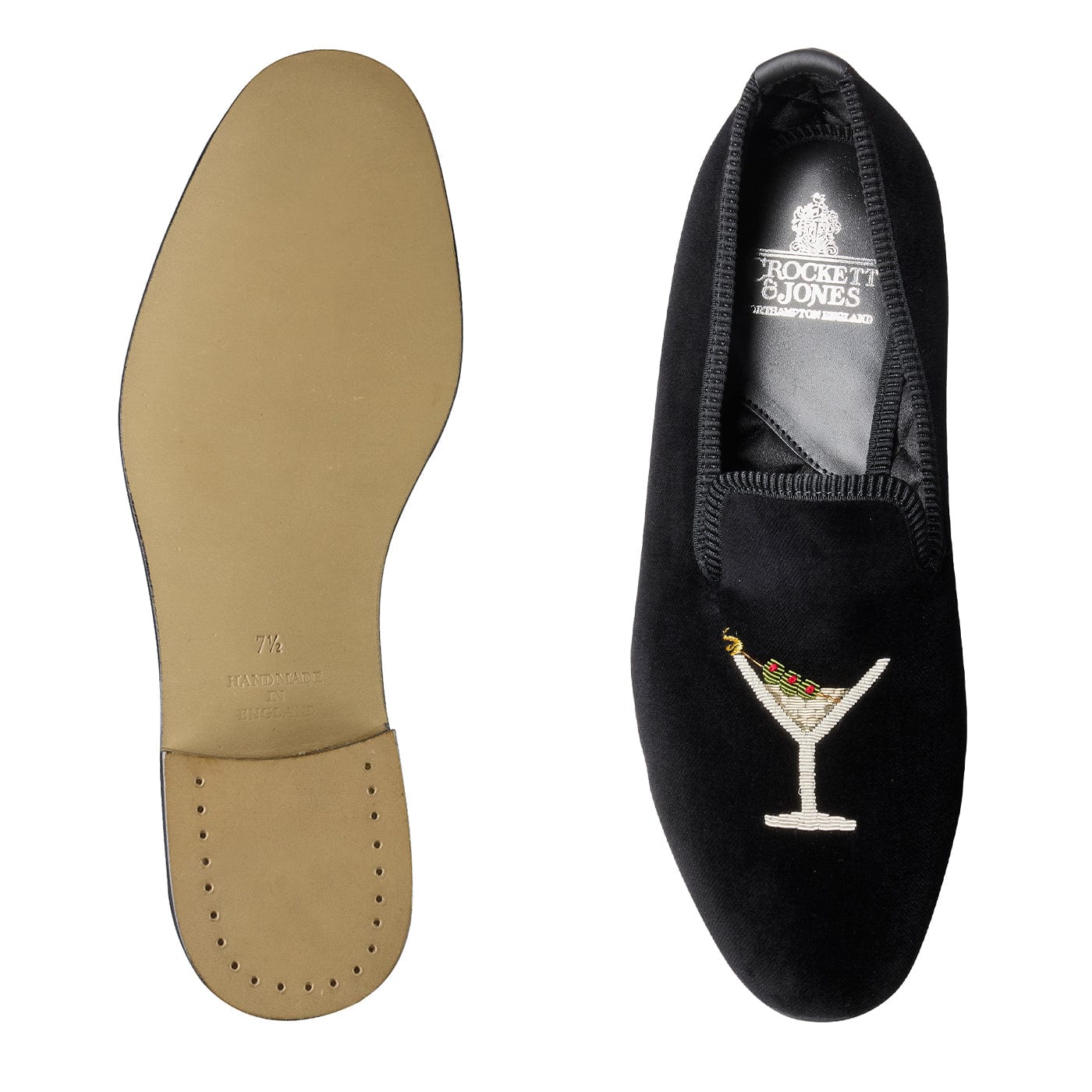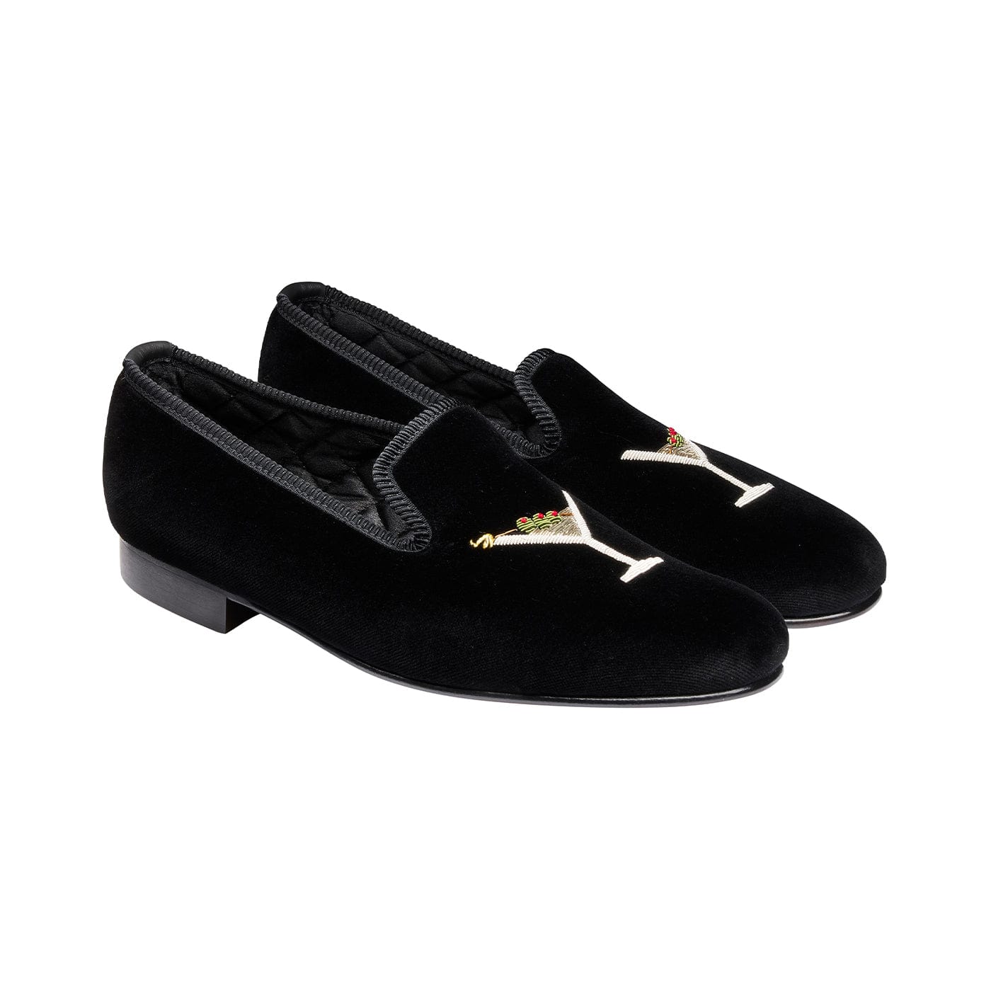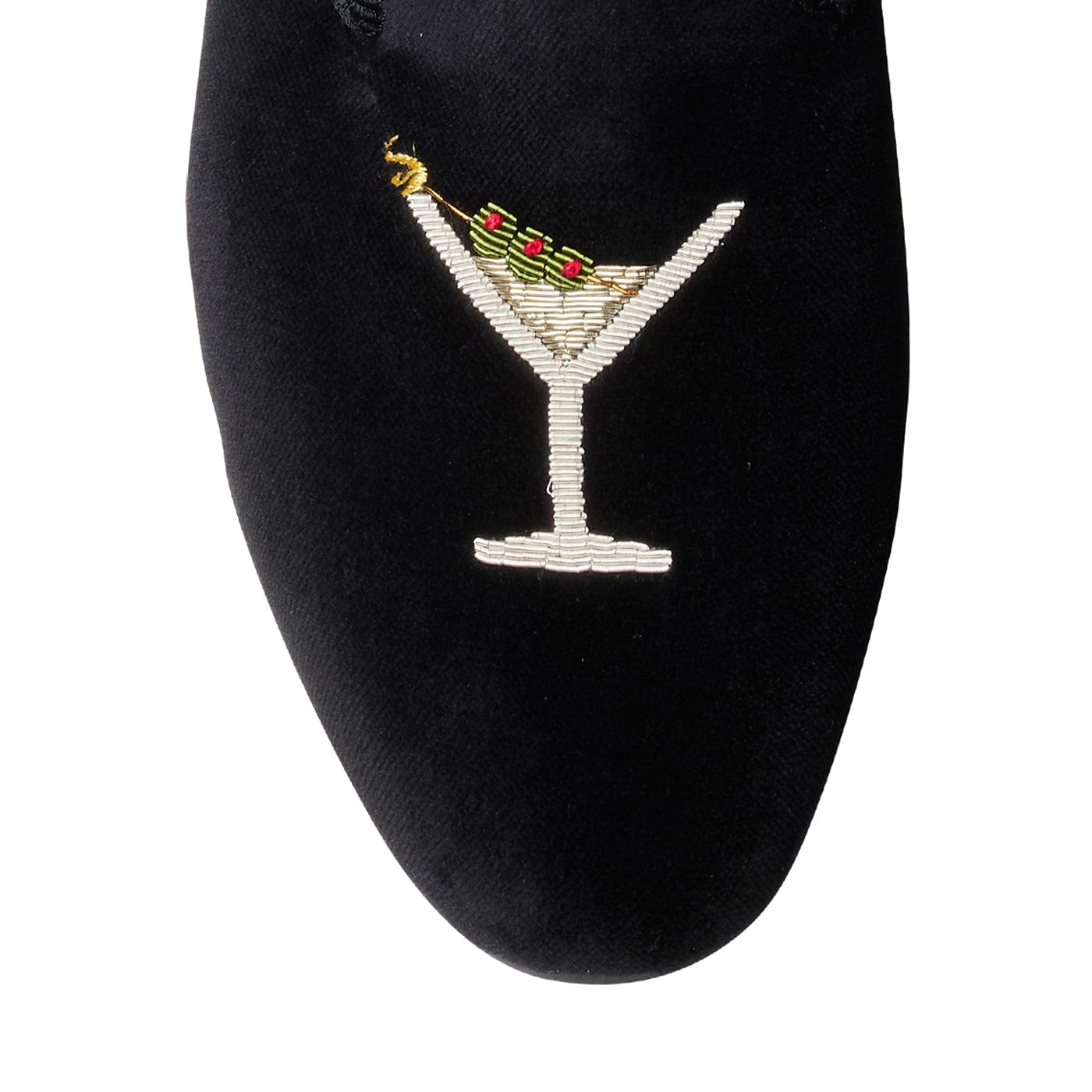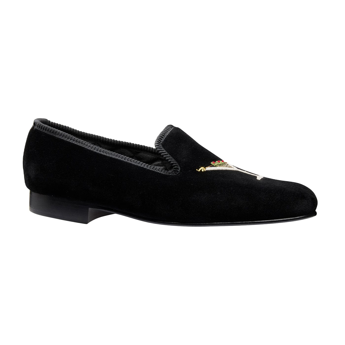 Martini, a house slipper with embroidery design made from black soft velvet, satin quilted linings and hard leather soles. From the Men’s Main Collection. N.B. When trying slippers on at home, you mi…