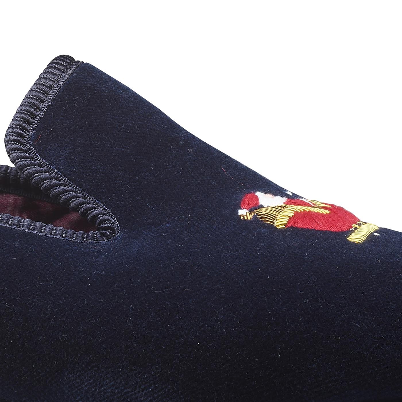 Santa, a house slipper with embroidery design made from soft navy velvet with satin quilted linings and hard leather soles. From the Men’s Main Collection. N.B. When trying slippers on at home, you …