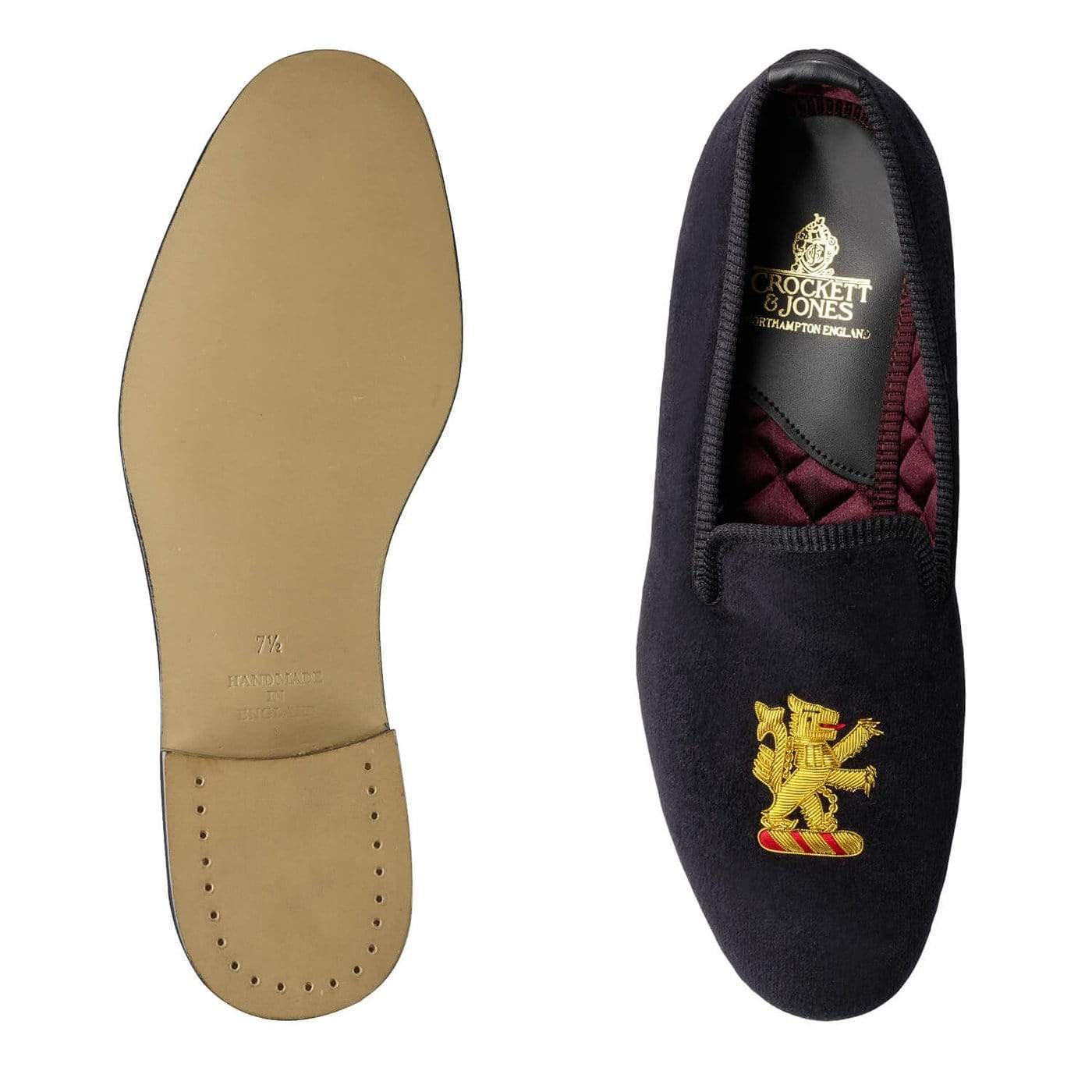 Lion Rampant, is a house slipper with embroidery design made from soft black velvet, satin quilted linings and hard leather soles. From the Men’s Main Collection.