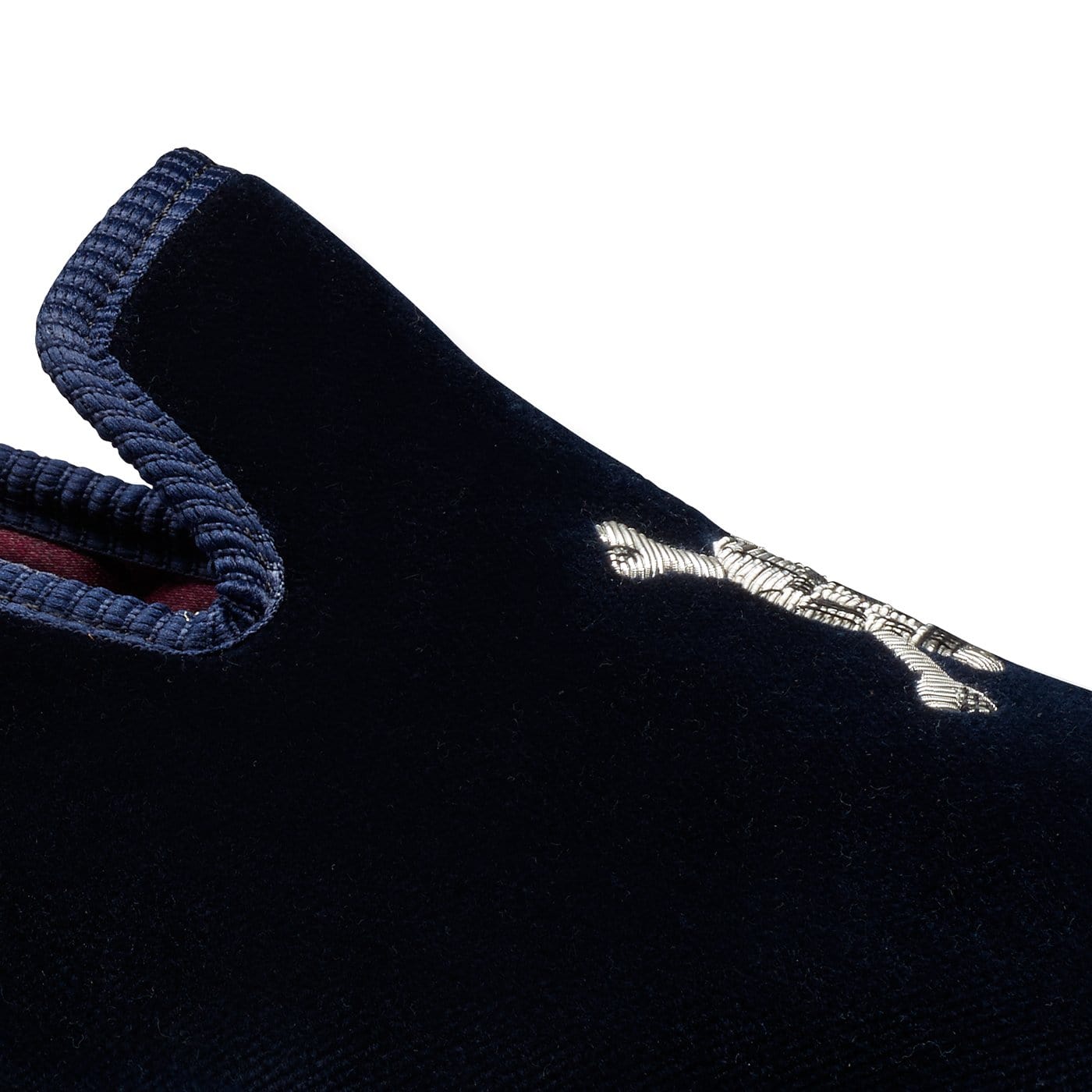 Skull & Crossbones, a house slipper with embroidery design made from soft navy velvet, satin quilted linings and hard leather soles. From the Men’s Main Collection. N.B. When trying slippers on a…